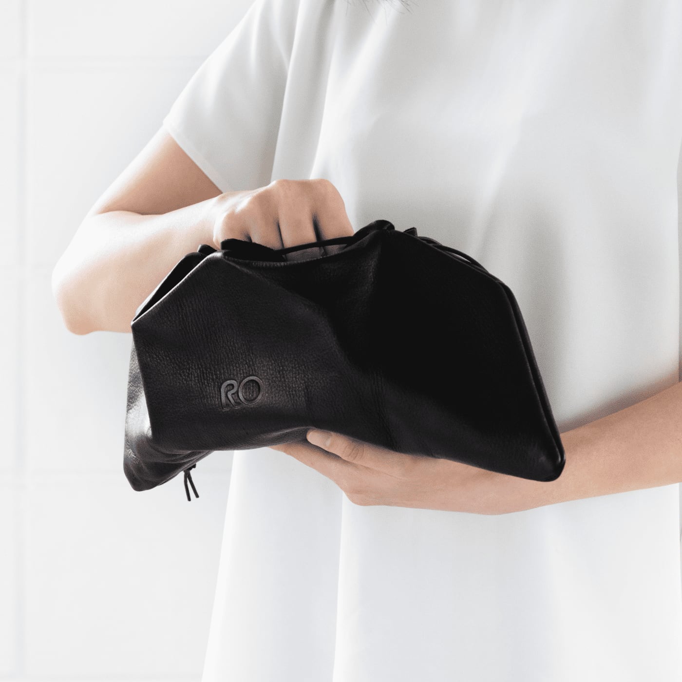 構造から生じる自然な直線がレザーならではの有機的なしなやかさと調和し、独自の造形を成しています。使わない時は平らに畳んで仕舞うことも可能なので、普段使いはもちろん旅先にも最適。従来の日本的な巾着とは違い、洋服にも着物にも合わせることができ、時代や性別、年齢、国籍、あらゆる垣根を超えてゆきます。カジュアルになりすぎず、フォーマルにもなりすぎない。